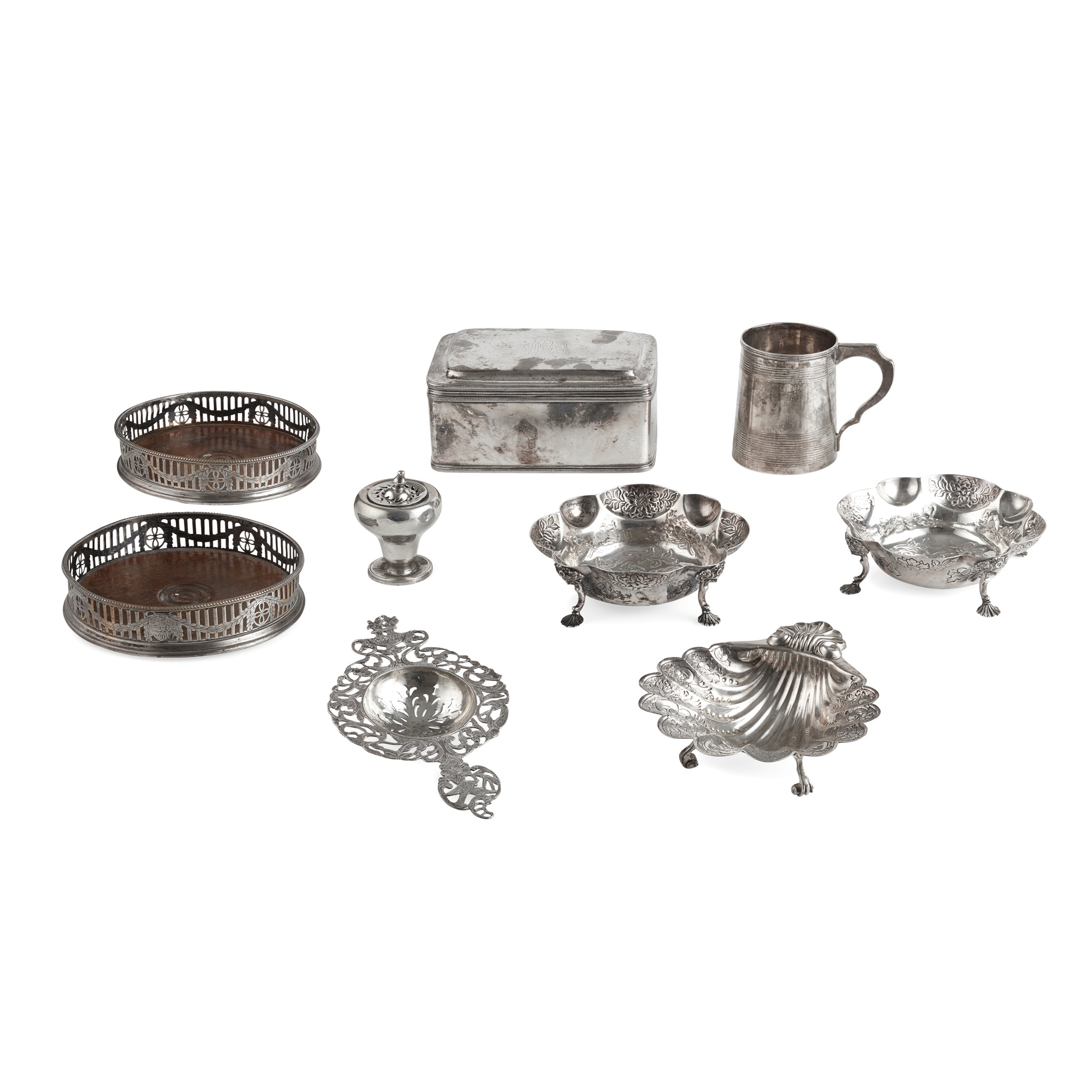 John Aldwinckle & Thomas Slater, London 1887, of lobed circular outline, chased floral decoration throughout, raised on three shell feet; together with a modern shell butter dish, Birmingham with engraved floral decoration, raised on three scroll feet; a pair of Georgian wine coasters with pierced sides; a George IV ponce pot and a Victorian mug; together with a Dutch tea strainer and a Dutch table box with engraved initials to the hinged lid