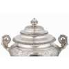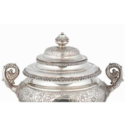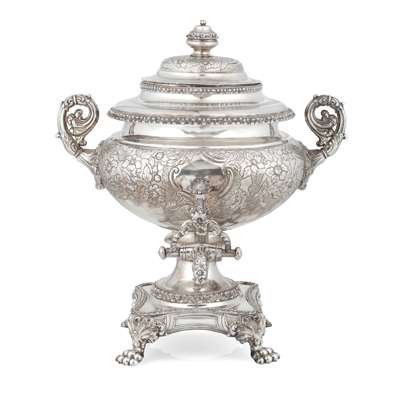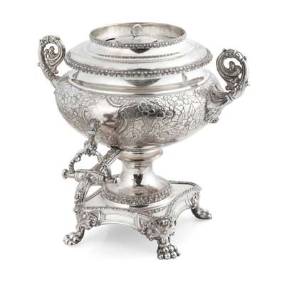of spherical bulbous outline, heavily chased floral decoration, floral and beaded borders, the pull-off domed lid with a knopped floral finial, leaf-capped reeded handles, the spout with shell handle and ivory insulator, raised on a rounded square base on four foliate-capped paw feet, with detachable silver-plated heating rod holder