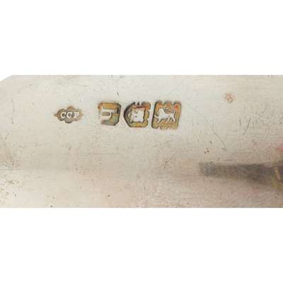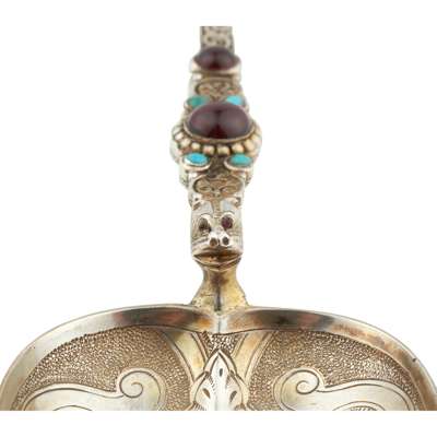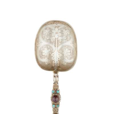 Sibray, Hall & Co Ltd, London 1903, modelled on the 12th-Century anointing spoon held in the British crown jewels, the bowl of bi-bulbous form with engraved decoration, the tapered stem with Cymric decoration and inset with various cabochon details, including turquoise and foil backed garnets