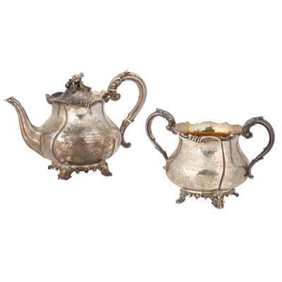 Charles Reily & George Storer, London 1844, each of panelled baluster form, engraved scroll decoration to each panel with presentation engravings to each central cartouche, acanthus clasped S-scroll handles, with ivory inserts to the teapot handle, the teapot with a domed hinged lid and floral finial, both raised on four bracket feet
