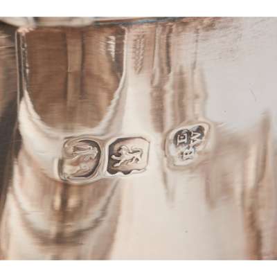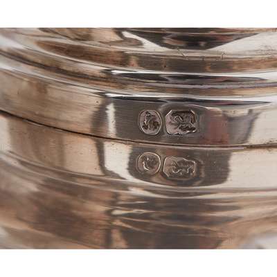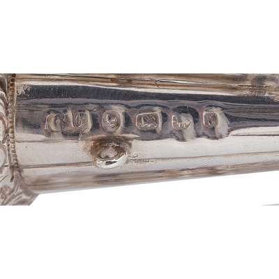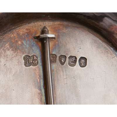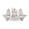 The Barnards, London 1840, of moulded oval outline, foliate scroll border, engraved crests to one cartouche, the central taper stick with an inkwell to each side, raised on four bracket feet