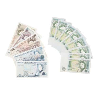 In case of issue; a group of banknotes; Treasury notes - £1 1978 AO1 000049 serial; £1 x 6 last issue; AO1 000148 serial; £10 AO1 000036 serial; 10/-; £5 AO1 000117; £10 1975 AO1 000049 serial; £5 01A 000003 serial; £50 AO1 000049 serial; £1 AN01 000049, serial; £20 01A 000049; three cased Maundy sets 1980, 1981, 1983