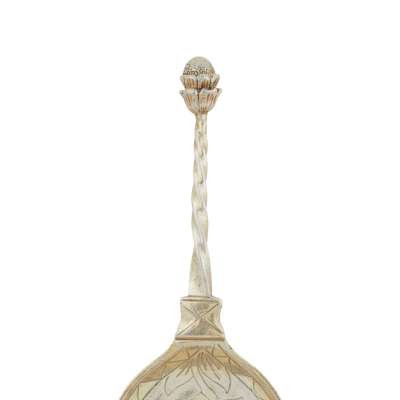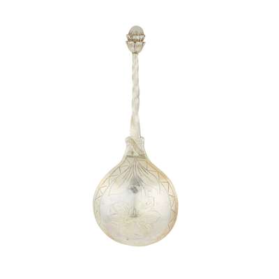 Martin Simmis, Pitea, 1756, the fruiting bud finial emanating from a double layer of foliage, above a wrythen stem with plain shouldered join to the ovoid bowl, the bowl with large engraved flower head and zig-zag border with gilt details, marked to base of stem