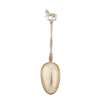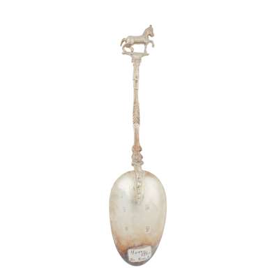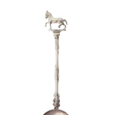 Jan Krook, Horn, 1730, with cast walking horse finial on a simple bracket above a shaped stem with chased and cast foliate detail, with elongated ovoid bowl with short rat tail to reverse, marked below rat tail