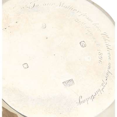 Hamilton & Inches, Edinburgh 1896, of squat circular form, with bellied body, engraved crest to body, pierced handle, engraved inscription to underside