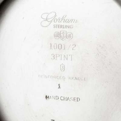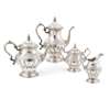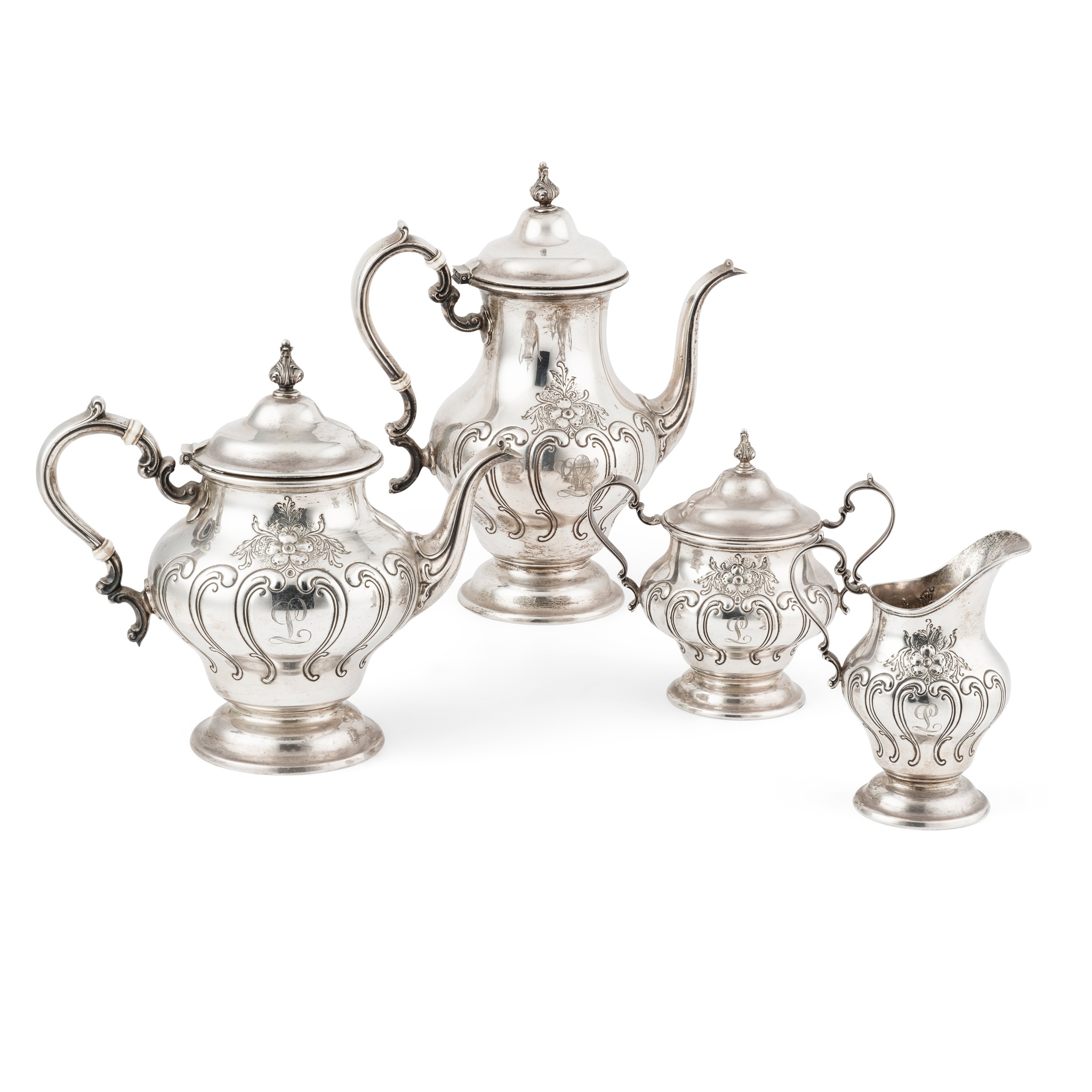 marked Gorham, Sterling silver, comprising a waterpot, teapot, twin-handled sugar basin with pull-off lid and a milk jug, all of baluster outline with demi-fluted scroll chased work, below chased floral detail, engraved L to centre, the S-scroll handles with ivory insulators to teapot and waterpot, the domed lids with acanthus clasped bud finials, each raised on a circular domed foot