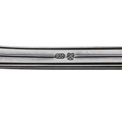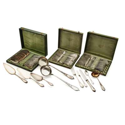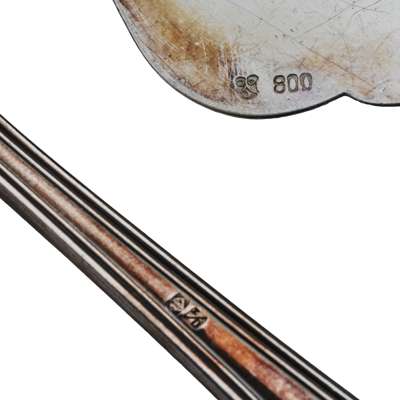 marked 800, retailed by F. Spitzbarth-Grieb of Zurich, comprising cased sets of twelve table spoons, table forks, dessert forks, table and side knives, and teaspoons, all with initials engraved to terminal and twelve coffee spoons with engraved initials, lacking case; together with two soup ladles, two serving spoons, twelve tablespoons, twelve dessert spoons, twelve table forks, twelve dessert forks, twelve teaspoons, twelve table knives and twelve side knives; together with various serving spoons, of the same pattern, a cake server and tongs of a different pattern