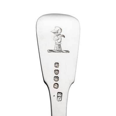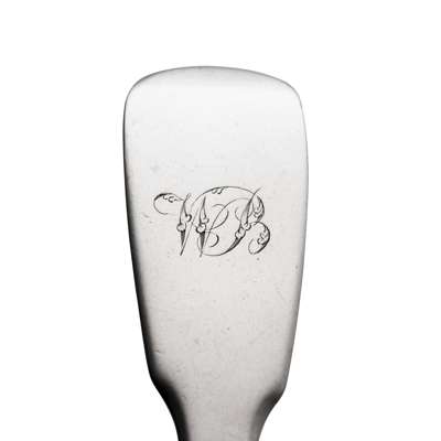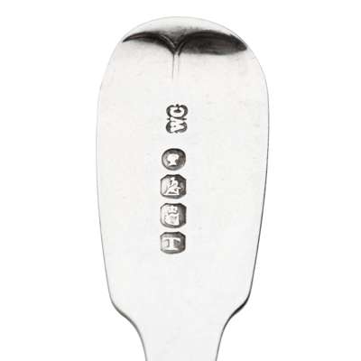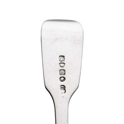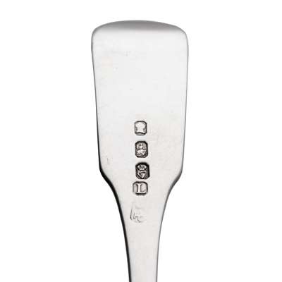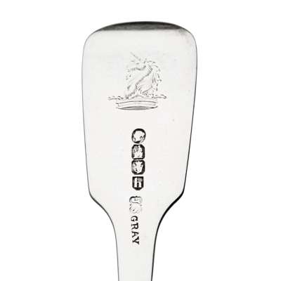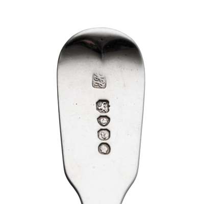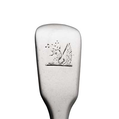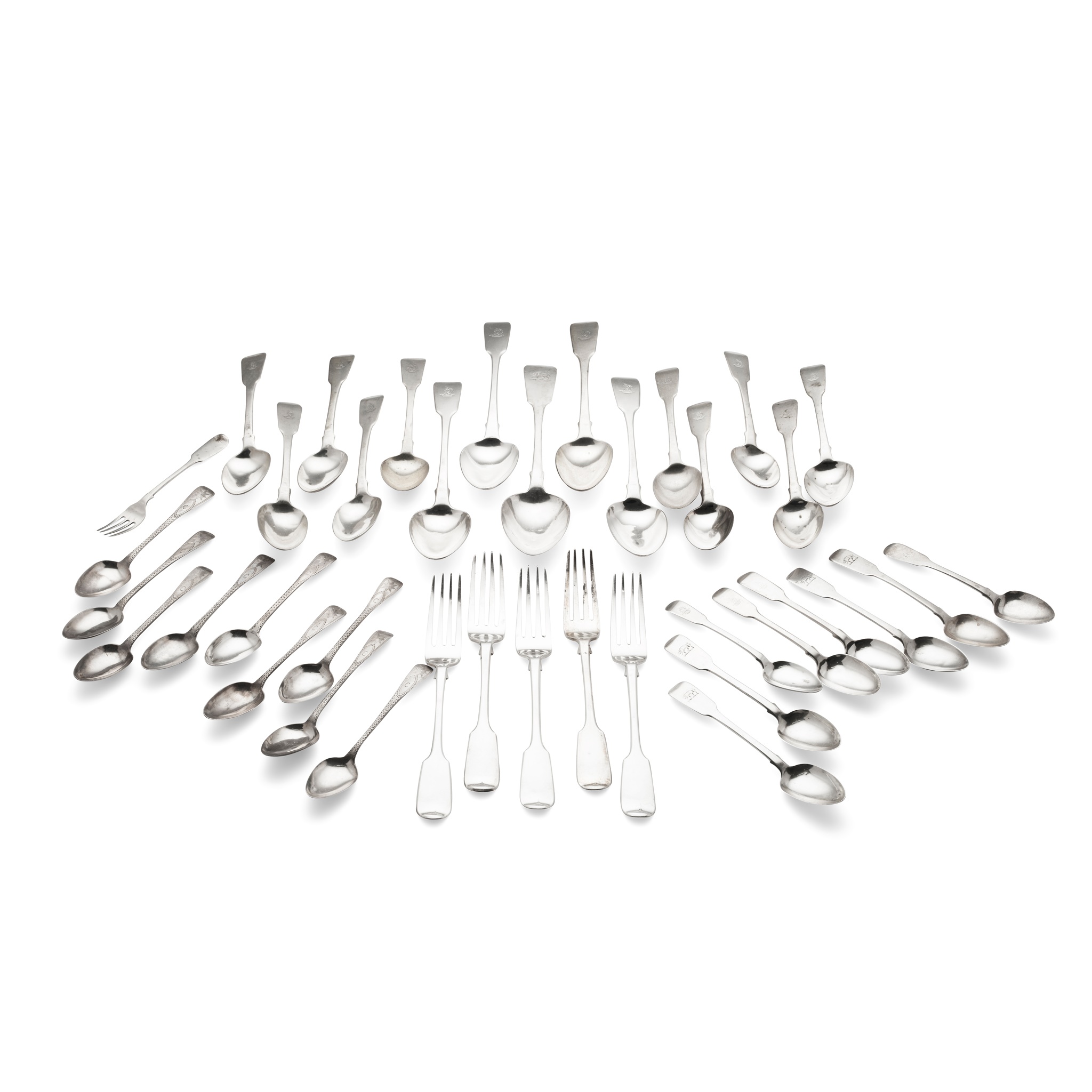 various makers and dates, mainly Dublin and London, comprising, five tablespoons, five table forks, ten dessert spoons, fifty-seven teaspoons, six condiment spoons and one pickle fork, all of Fiddle pattern, rat-tail bowls, most with crest engraved to terminal; together with a set of twelve teaspoons, of Old English Bright-cut pattern