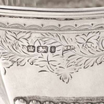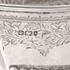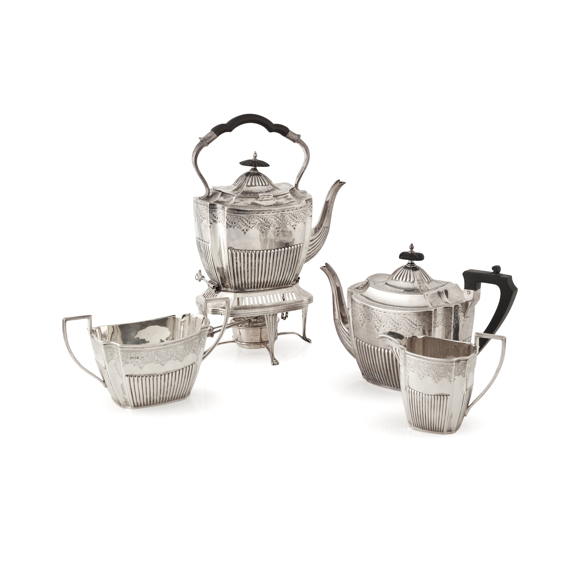 Walker and Hall, Sheffield 1899, comprising, a spirit kettle and stand, teapot sugar and cream jug, all of rounded rectangular form with re-entrant corners, demi-ribbed, Bright-cut border, threaded angular handles