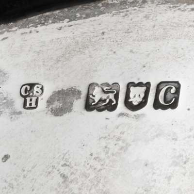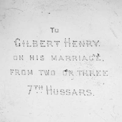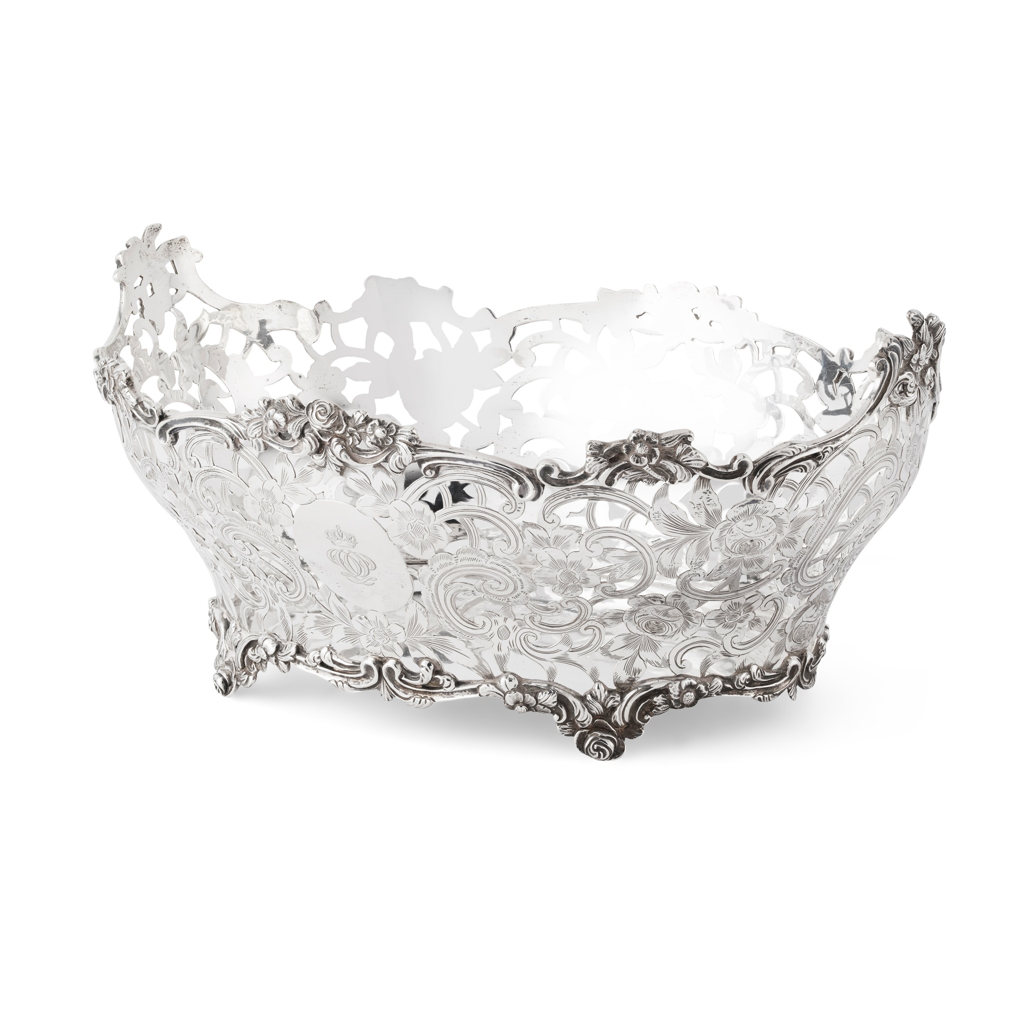 Charles Stuart Harris, London 1898, of oval outline, the pierced sides with floral decoration, the central oval cartouche with the Prince of Wales' coronet to one side and the Hussar symbol to the other, presentation engraving to the centre of the dish, 'TO GILBERT HENRY ON HIS MARRIAGE FROM TWO OR THREE 7TH HUSSARS' raised on cast floral bracket foot with engraved names to the underside