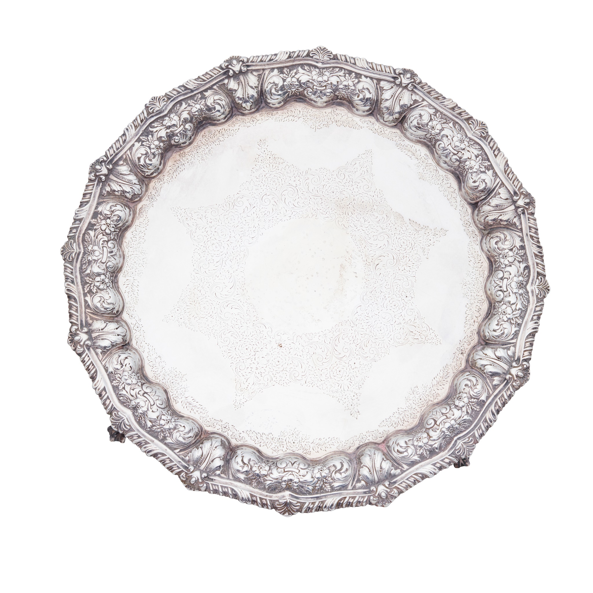 Thomas Russell and co, Sheffield 1896, of circular form, cast gadrooned border, chased foliate inner border, engraved flats, all raised on claw and ball legs