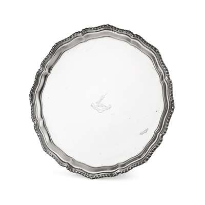 The Barnards, London 1877, of traditional outline, with all-over chased Oriental scenes, shield cartouche to centre engraved with initials, the handle modelled as a dragon; together with a salver, E. Silver & Co, Sheffield 1951, of moulded circular outline with gadrooned border, engraved crest to centre