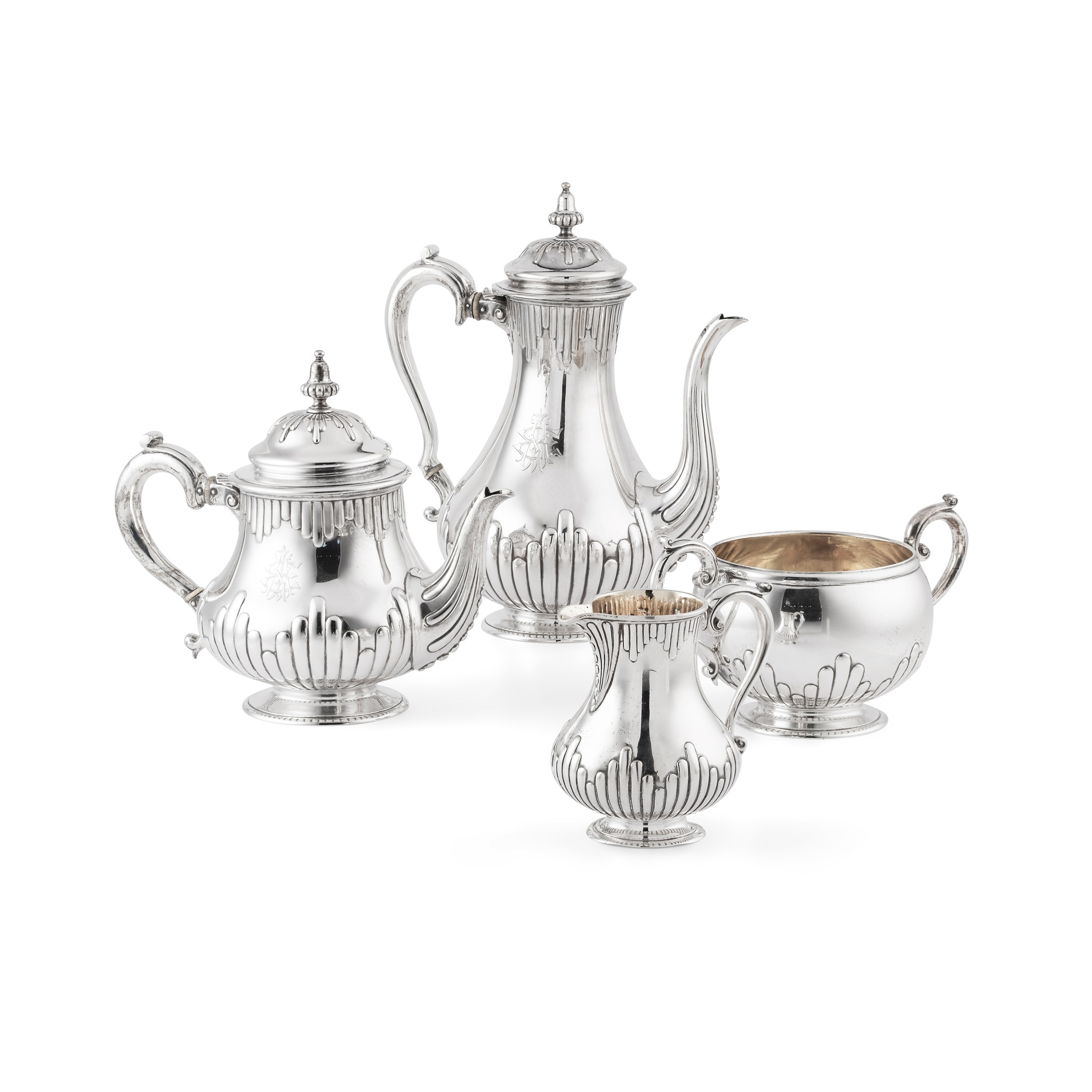 Hunt Roskell Mortimer Storr, London 1875/76/ 1867/76, comprising a coffee pot, teapot, twin-handled sugar basin and a milk jug, all of baluster outline, with stylised fluting to the lower body, engraved monogram to each, S-scroll handles, with ivory inserts to the coffee pot and teapot, each raised on a circular foot
