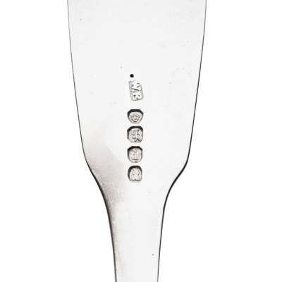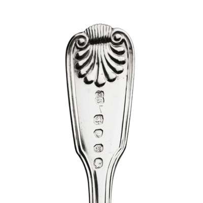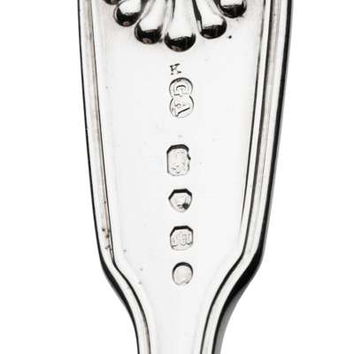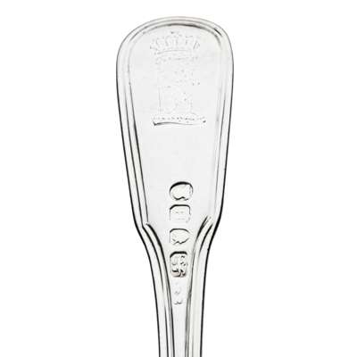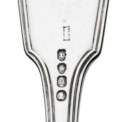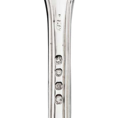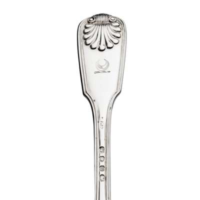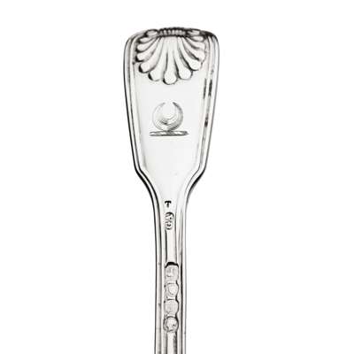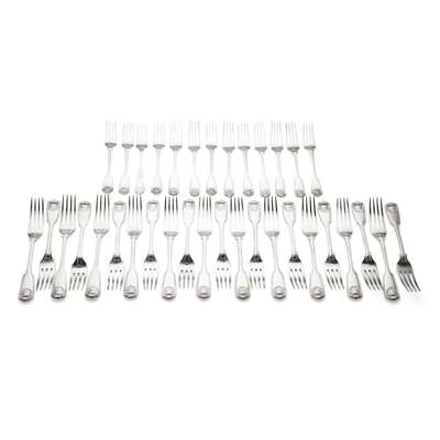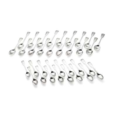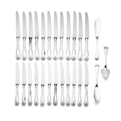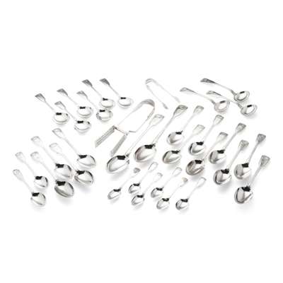 various makers, predominately mid-Victorian, double struck and engraved crest comprising; twenty-two table forks; twelve dessert forks; eighteen dessert spoons; fifteen teaspoons; twelve large tablespoons; six soup spoons, single struck, Sheffield 1948; three sauce ladles; twelve each with silver handle modern side and table knives, stainless steel blades