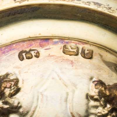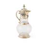 John Wilmin Figg, London 1860, modelled in the shape of Elizabethan wine flagons, the neck with embossed lion masks, hinged cover gadroon edge knopped finial, vine clasped scroll handle, gadrooned lower frame enclosing the etched bulbous glass body, silver gilt foot rim
