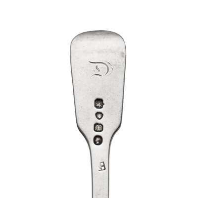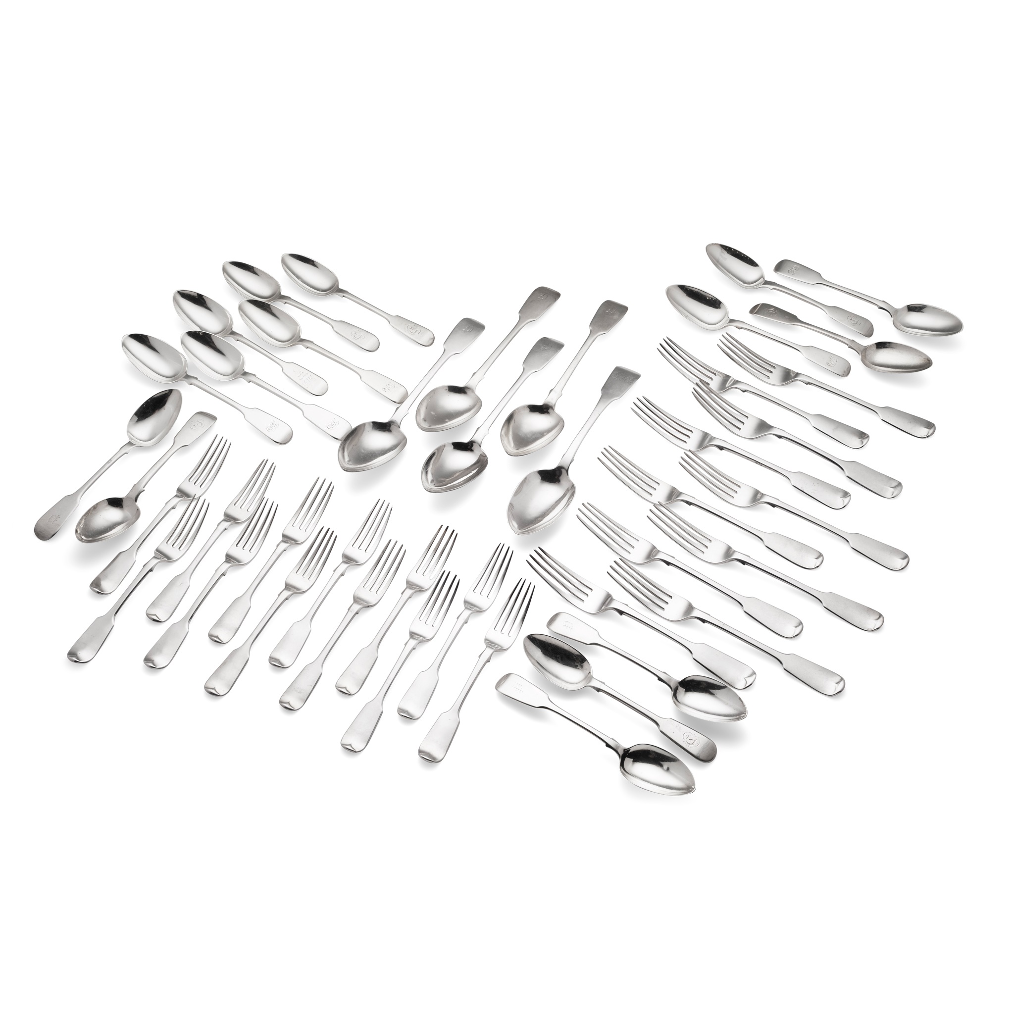 various makers and dates, comprising five tablespoons, ten table forks, fifteen dessert spoons and twelve dessert forks, all of Fiddle pattern, some with engraved initials to terminal