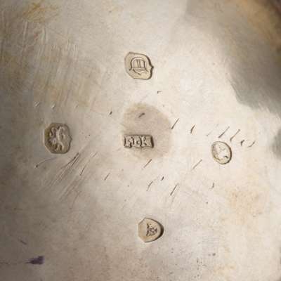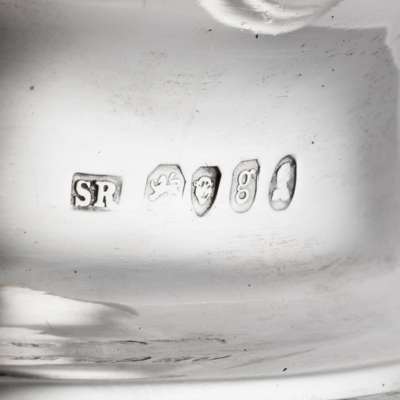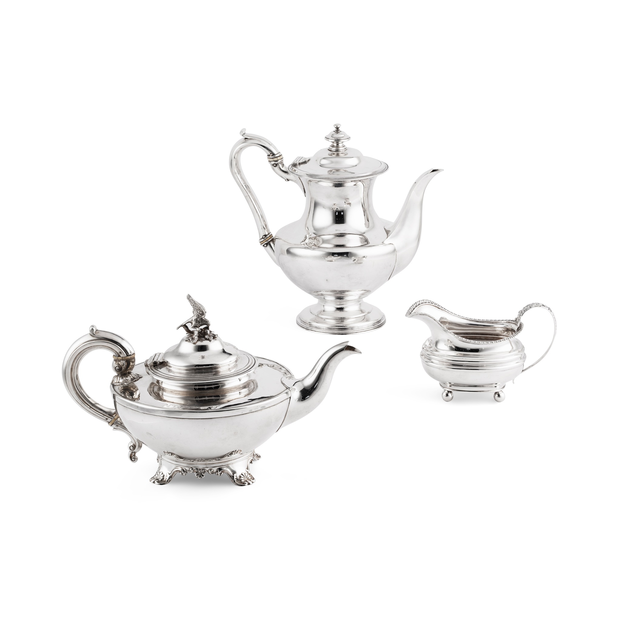 John James Keith, London 1839, of squat circular form, crest engraved to upper body, C-scroll handle with ivory insert, the hinged lid, with cast bird finial; together with a waterpot, Richard Pearce & George Burrows, London 1830, of plain baluster outline, ivory inserts to handle, knopped finial and a milk jug, SR, London 1822, gadrooned border, raised on four ball feet