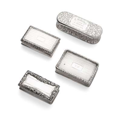 Joseph Willmore, Birmingham 1838, cast foliate border, to a vacant cartouche; Joseph Willmore, Birmingham 1825, of unusual bowed form, engine turned detail throughout, initials to centre of the hinged lid, cast foliate border and thumb-piece; Joseph Willmore, Birmingham 1823, cast foliate border; and Alfred Taylor, Birmingham 1860, of rounded rectangular outline, all-over scroll and foliate decoration, engraved presentation inscription to the hinged lid