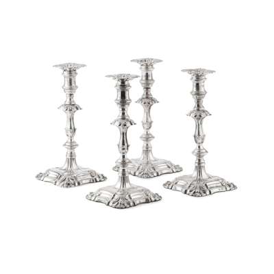 Waterhouse, Hodson & Co, Sheffield 1833, each of knopped baluster outline, to a square foot with leaf clasped corners, engraved crest and motto to base, the removable sconces of similar design