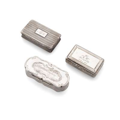to include, TS, Birmingham 1828, of rectangular outline, foliate thumbpiece, with an engraved presentation inscription to the lid '1831'; together with another, Francis Clark, Birmingham 1847, all-over striated design, with a foliate thumbpiece and engraved cartouche to hinged lid, and another, Nathaniel Mills, Birmingham 1853, of rounded outline, engraved 'William Robertson' to hinged lid