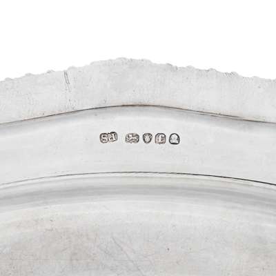 Paul Storr, London 1821, of shaped oval outline with a cast gadrooned and leaf clasped shell border, engraved Gothic D to one side of rim, crest and coronet to the other side