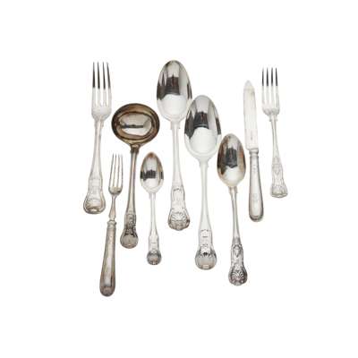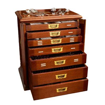 various marks and dates, predominantly, Chawner, comprising, forty eight table forks, thirty six tablespoons, a soup ladle, fish slice, five sauce ladles, twenty four teaspoons, twelve egg spoons, eighteen dessert forks, all of Hourglass and Shell variant patterns, various initials and crests engraved to terminal; together with a set of twelve fish knives and forks and a collection of ivorine handled knives, all contained in a seven drawer oak canteen