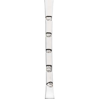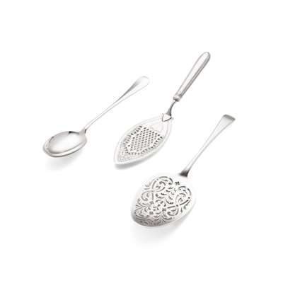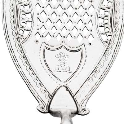 Thomas Chawner, London 1772, of Feather Edge pattern, the pierced broad blade with a scroll design; together with another Robert Hennell, 1788, with engraved crest to a shield cartouche, filled handle and a modern basting spoon, A. Haviland-Nye, London 2002, of Hanoverian pattern, rat tail bowl