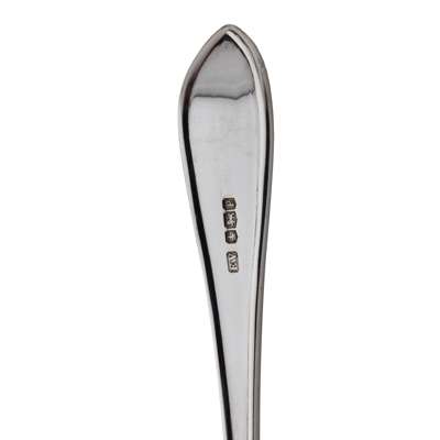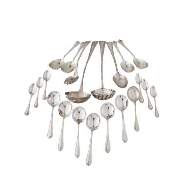 to include, a George III Irish soup ladle, circa 1770, with shell-shaped bowl, and a chased handle hook terminal; another plain, Edinburgh circa 1770; a French sugar sifter, Christofle; three various small ladles; George III serving spoon/fork; serving spoon, Old English with beaded border; a set four Onslow pattern serving spoons, with shell bowls; two sets of similar pointed terminals pattern soup spoons; eleven single struck teaspoons; nine double struck teaspoons
