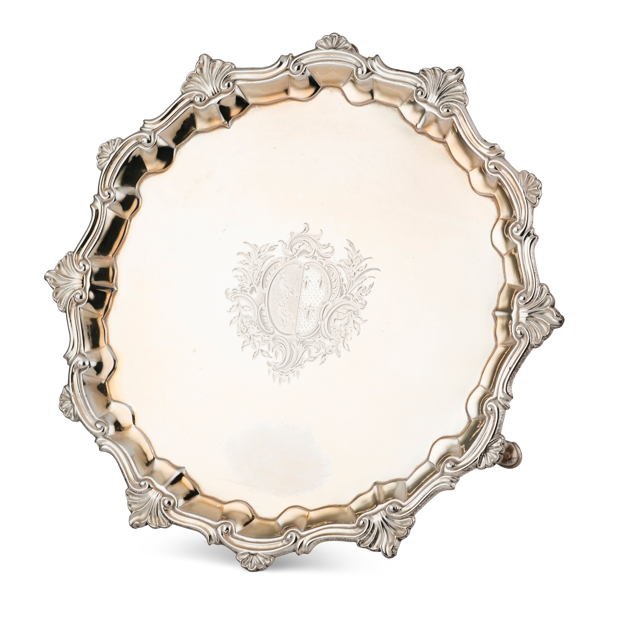 William Peaston, London 1750, of circular outline with a raised shell border, engraved armorials to the centre, raised on three hoof feet