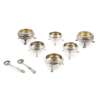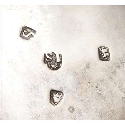 James Smith, London 1733, of circular form, gadrooned border, gilt interior and glass liners, raised on three hoof feet; together with four matched circular salts and a pair of Fiddle pattern Edinburgh salt spoons