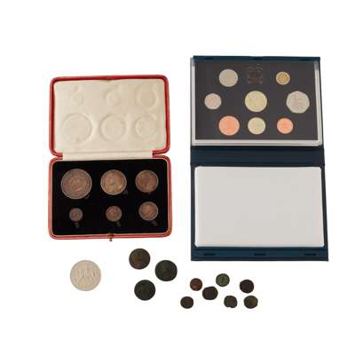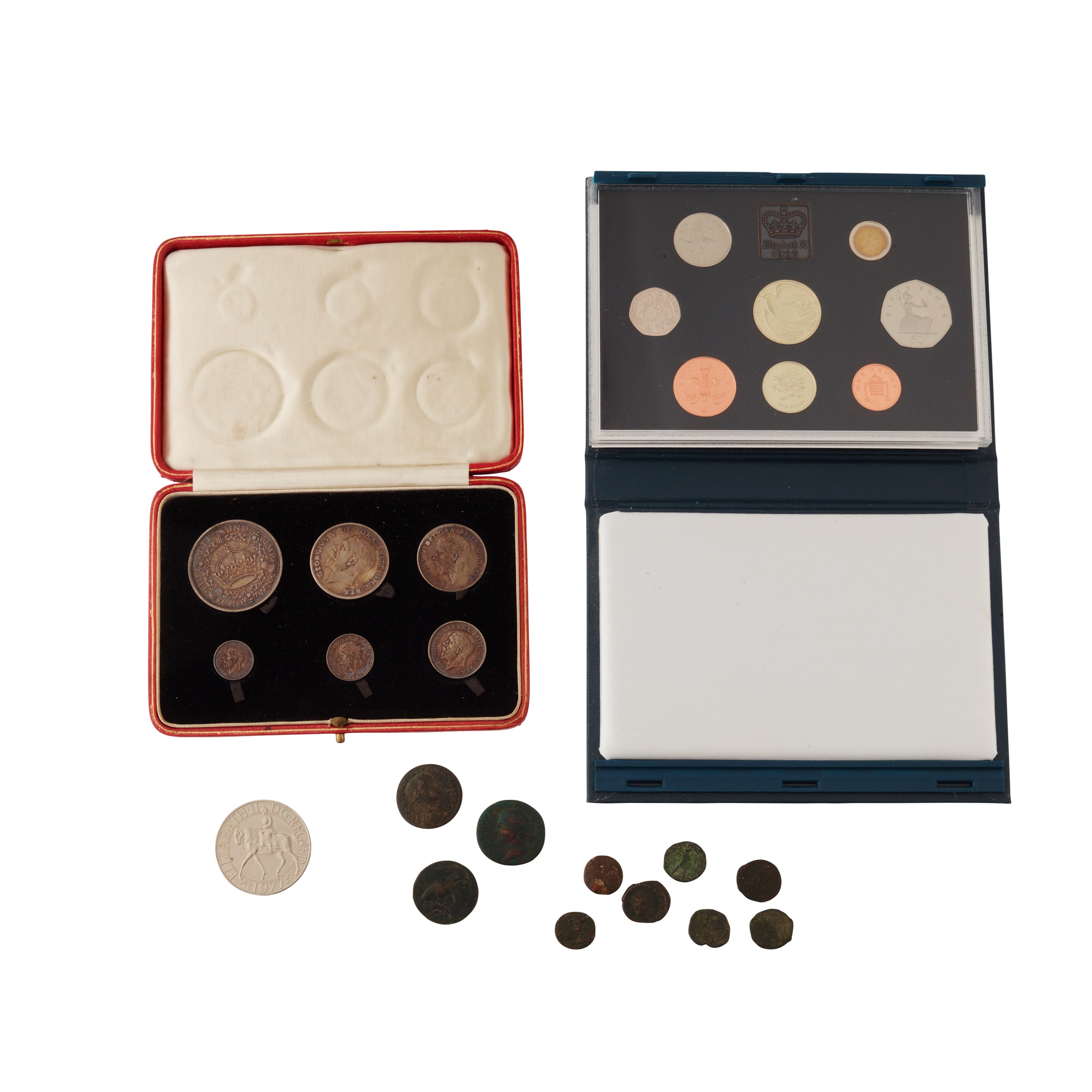 Crown, half crown, florin, shilling, sixpence, three pence, silver in original case of issue; 1995 cased year set coins; 1977 jubilee crown; small group bronze Roman/Greek coins
