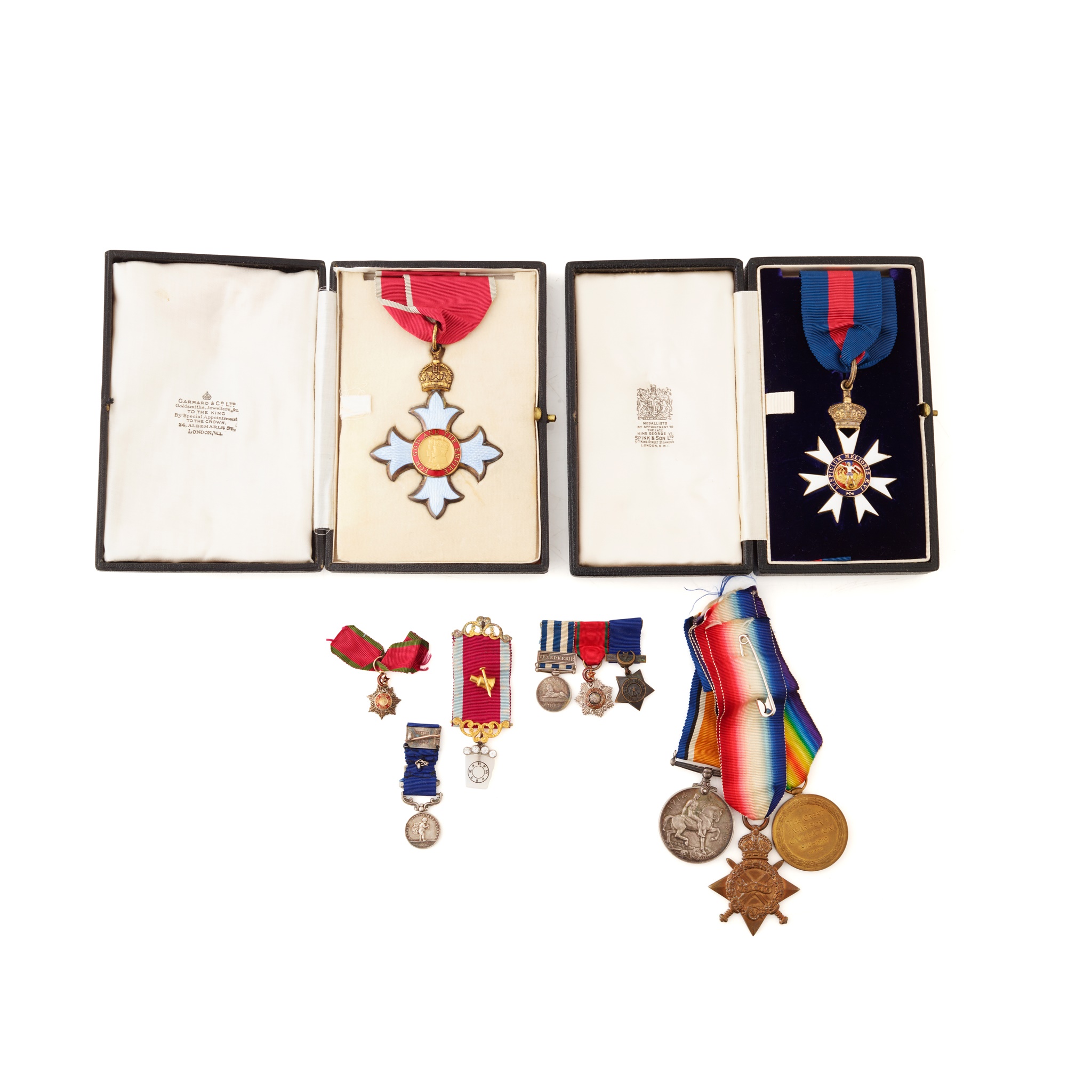 AVM, BWM, 1914-15 star, miniatures to include; Royal Humane Society medal (Silver), Egypt 1882 medal with bar -Tel El Kebir, Ottoman Turkish Medal, Khedive’s star and a Masonic miniature medal (10) together with a cased C.M.G. Neck badge; to H V Cusack invested 15th February 1955 and a cased C.B.E.