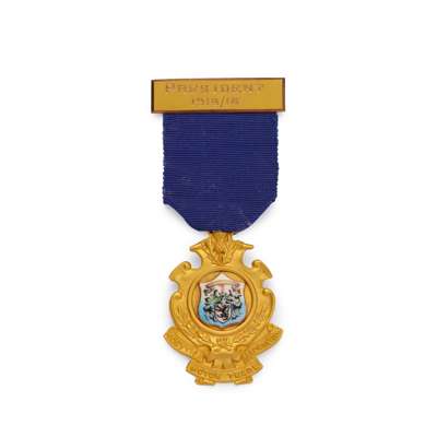 the enamel coat of arms in a swag border with thistle surmount detail, for the 'Scottish Motor Trade Association', with bar engraved President 1915/16, W G Maxwell to the rear