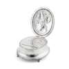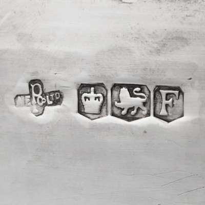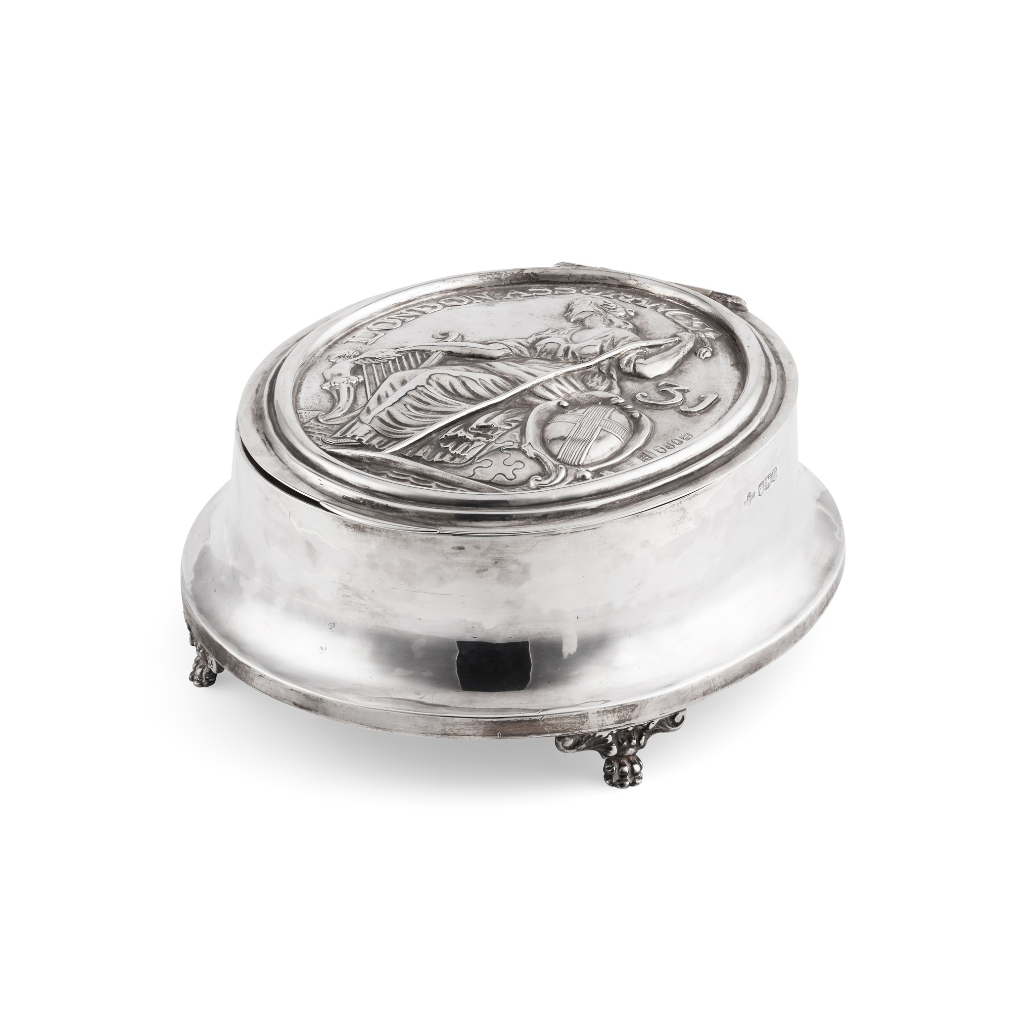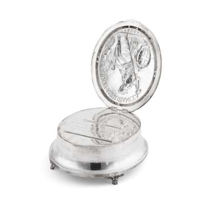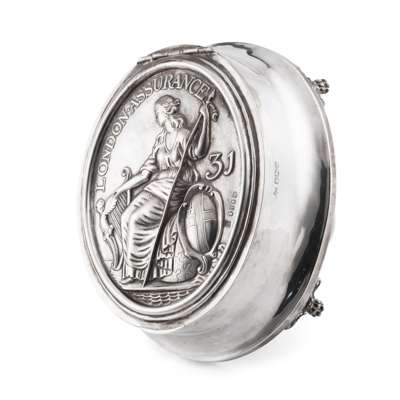 A E Poston & Co Ltd, Sheffield 1948, of oval outline, raised on four paw feet, with three wells, the largest with an engraved presentation inscription, the hinged lid, with hallmarks for Robert Hennell I & David Hennell II, London 1801, formed from an officer's badge of the London Assurance Company, of oval outline, with chased depiction of their trademark logo, Brittania and LONDON ASSURANCE