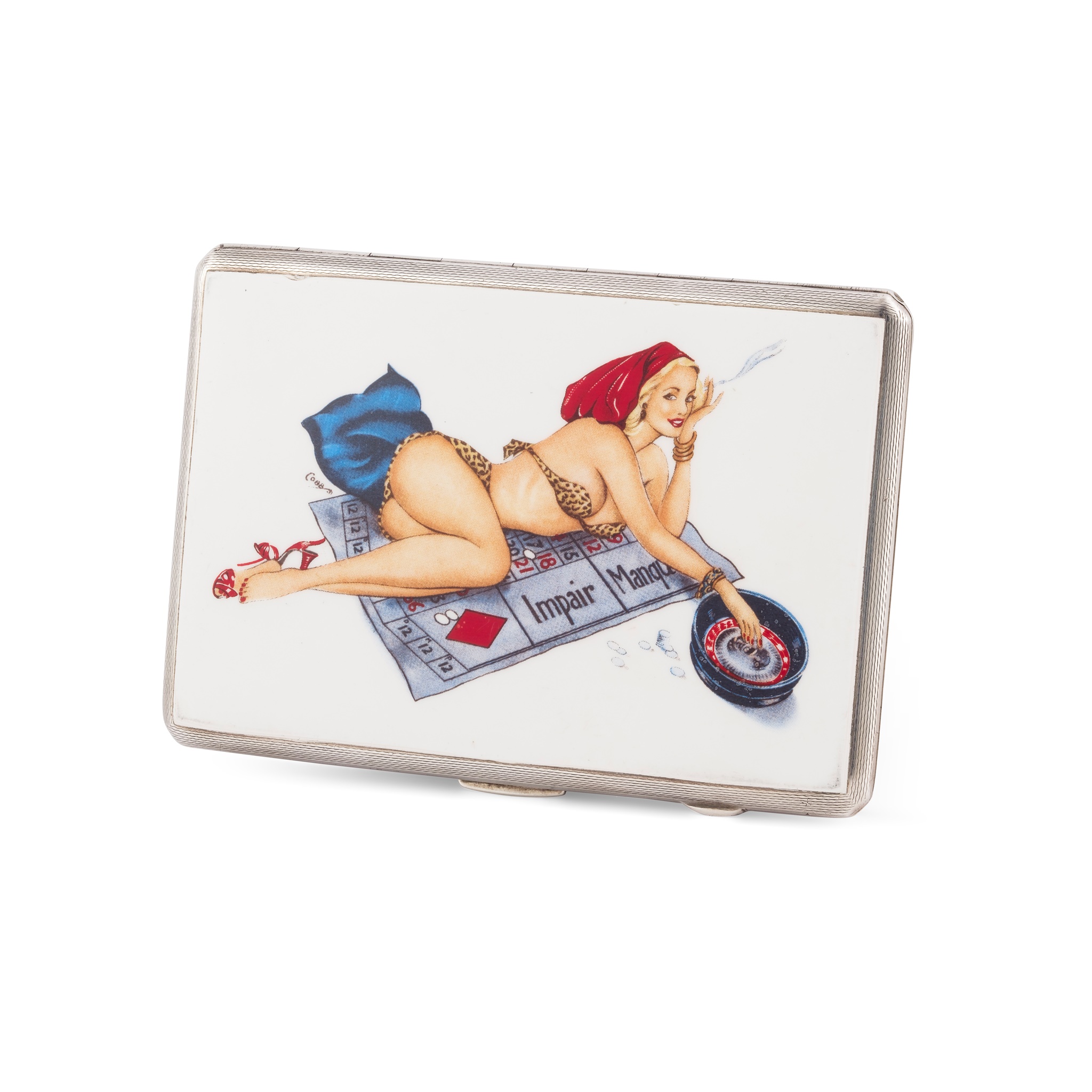 G Loveridge & Co., Birmingham 1944, of rectangular outline, the hinged lid with a depiction of a 1940s pin-up across a roulette table