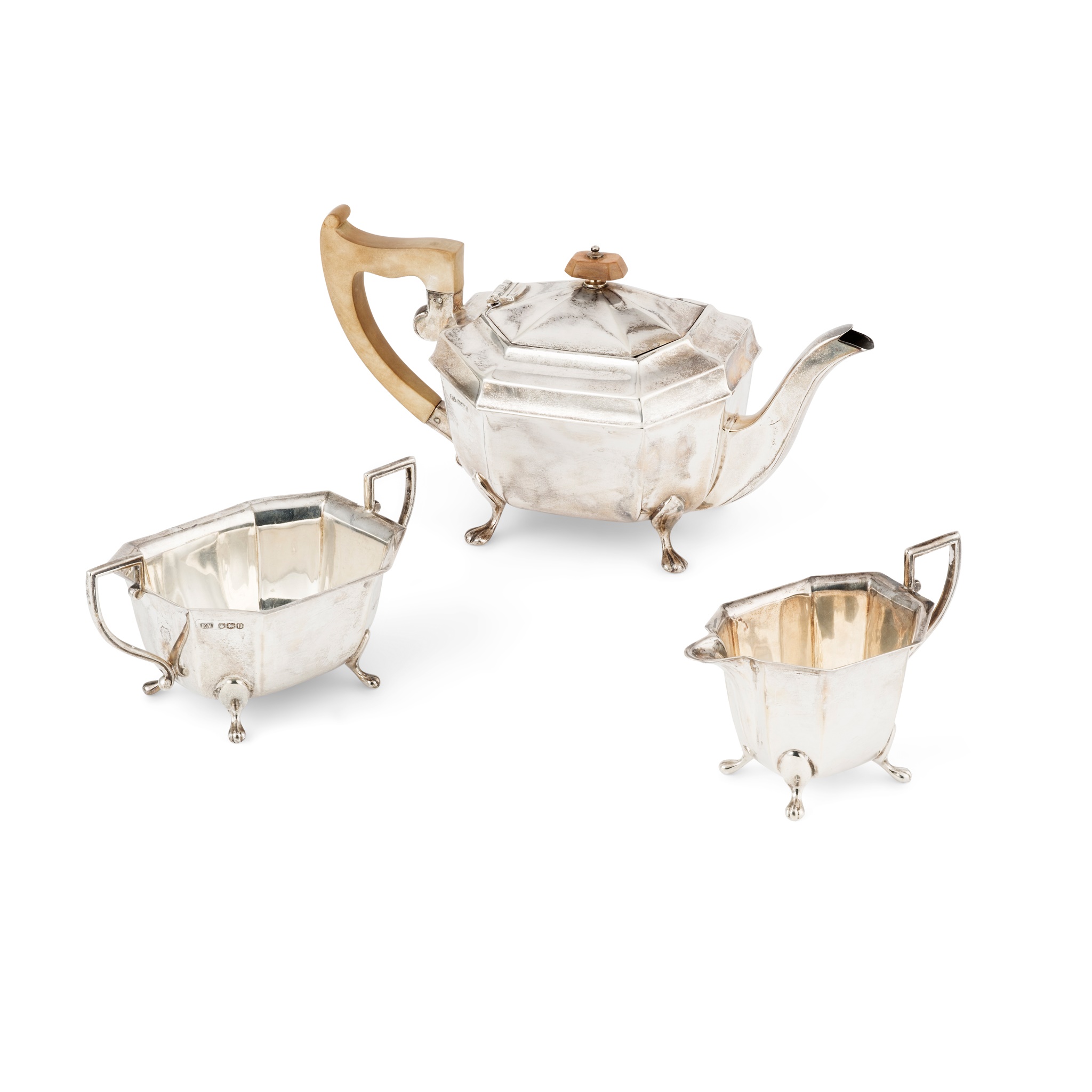 Viner's Ltd, Sheffield 1937, comprising a teapot, twin-handled sugar basin and a milk jug, all of octagonal outline, with angular handles, each raised on four paw feet