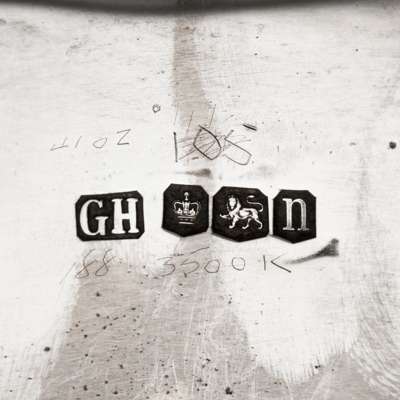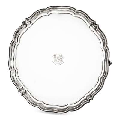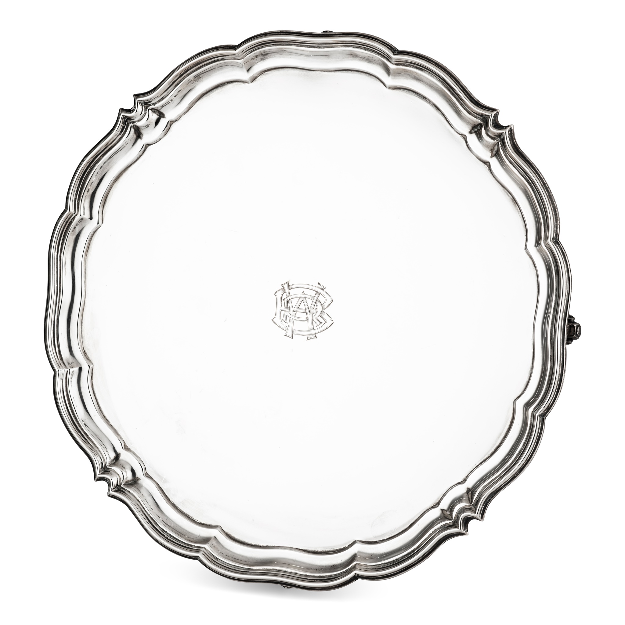 Harrison Brothers & Howson, Sheffield 1930, of circular outline, with a raised moulded border, engraved initials to the centre, raised on four scroll and ball feet