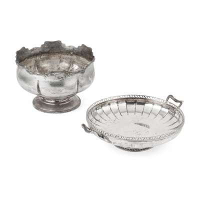 Atkin Bros, Sheffield 1933, of slightly lobed circular form with undulating rim, raised on a circular foot; together with a shallow twin-handled bowl, London 1850, with a pierced border, raised on a circular foot with similar pierced border