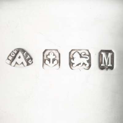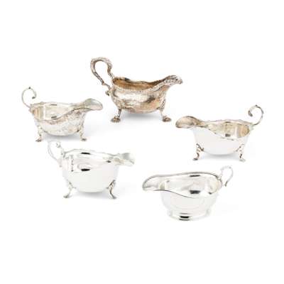 various makers and marks, to include a pair, Barker Brothers, Chester 1923, with a scallop border and another, Adie Bros, Birmingham 1936; together with another, Brook & Sons, Sheffield with a beaded border, and another Victorian with a gadrooned border and acanthus clasped S-scroll handle, raised on three shell clasped feet
