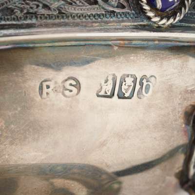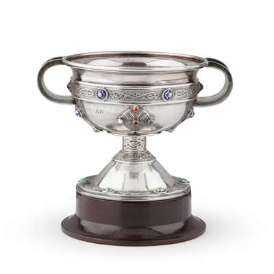 RS, Dublin 1917, with enamel set bosses and Celtic motif borders, the underside of the foot engraved ‘CHARLES FRANCE. ELIZABETH GALBRAITH. 1869. 4 AUGUST. 1919’, on an associated plinth and presented in a fitted case, retailed by R. Stewart of Glasgow