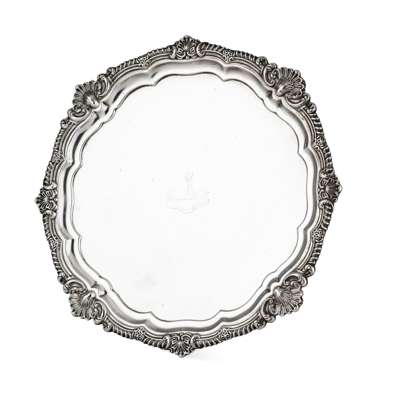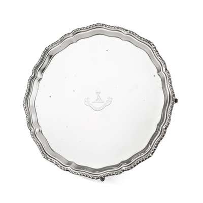 Goldsmiths & Silversmiths Co Ltd, London 1909, of circular outline with a cast gadrooned and shell border, engraved crest and motto to the centre, raised on four scroll ball feet; together with another, Barker Brothers, Birmingham 1909, with a gadrooned border and engraved crest and motto to centre