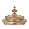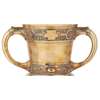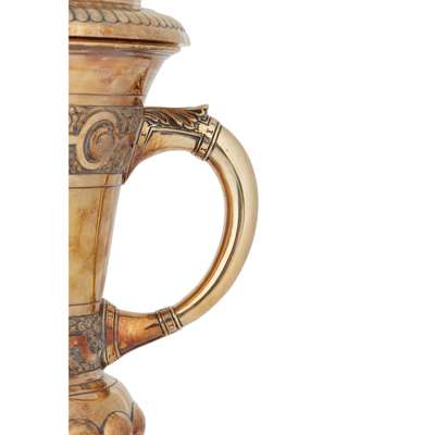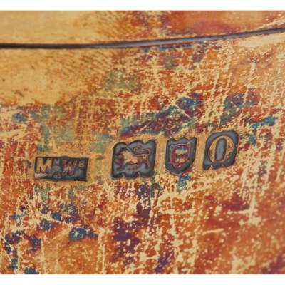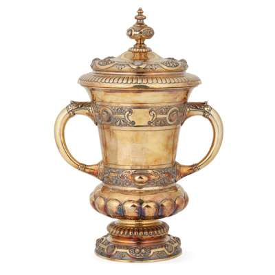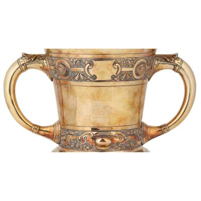 Mappin & Webb Ltd., London 1909, the tapering cylindrical body with two borders of repoussé work, each with floral detail, C-scroll acanthus clasped handles, to a bulbous base with ribbed detail, the short stem to a domed circular foot with chased detail in a matte ground, the pull-off cover with a gadrooned border and similar repoussé border, similar decoration to the knopped finial