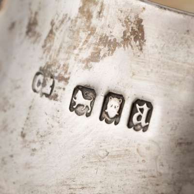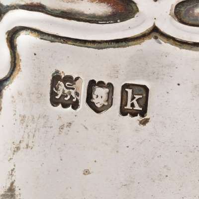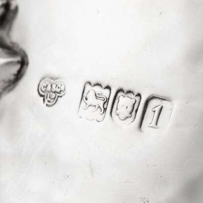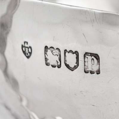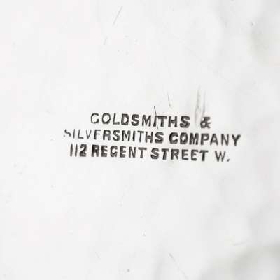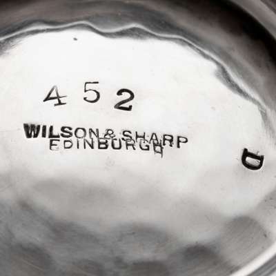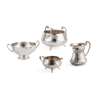 to include, a three-footed sugar basin, Goldsmiths & Silversmiths Co Ltd, London 1906, of planished finish, the three scroll handles with foliate terminals; together with another twin-handled bowl, retailed by Wilson & Sharp of Edinburgh, London 1910, the bi-furcated handles with foliate terminals, and a similar milk jug, London 1916; together with another milk jug, Edwin Edward Dunthorne, London 1905, with registration mark 442136