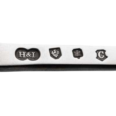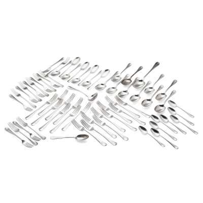Hamilton & Inches, Edinburgh 1908, comprising, a basting spoon, a sauce ladle, ten tablespoons, eighteen table forks, eight dessert spoons, sixteen dessert forks and eight teaspoons, all of Hanoverian pattern, engraved crest in a laurel wreath to terminal; together with a Scot's Fiddle pattern dessert spoon, Josiah Williams & Co, London 1927