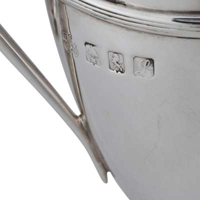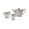 Edwards of Glasgow, Glasgow 1908, comprising a teapot, sugar and cream jug, each of navette shape, threaded bands, engraved and dated 1909, ivory handle and finial to teapot