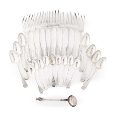 Edinburgh various makers and dates, to include, ten table forks, seven dessert spoons, and eight teaspoons; together with a Scottish provincial teaspoon, Robert Keay of Perth, of Fiddle pattern and a sugar sifter, London 1890, with apostle terminal