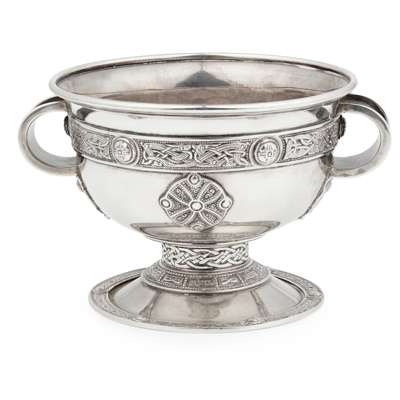 George Edward & Sons, (of Glasgow) London 1900, the hemi-spherical bowl with a band of interwoven zoomorphic motifs and Celtic bosses and applied Celtic discs to body, the C-scroll handles with Celtic decoration, raised on a circular foot with similar decoration