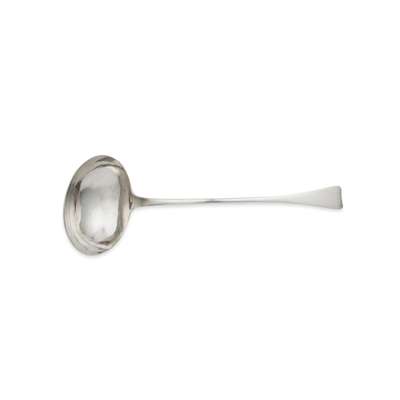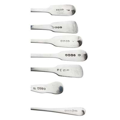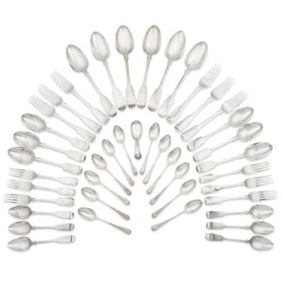 London, various makers and dates, comprising, a soup ladle, 1811, six tablespoons, six table forks, six dessert forks, six dessert spoons, and six teaspoons, all of Fiddle pattern with vacant terminals; together with a tea caddy spoon, Andrew Wilkie, Edinburgh 1830 and a set of twelve teaspoons, Glasgow 1875, with Bright-cut engraving and engraved initial to terminal