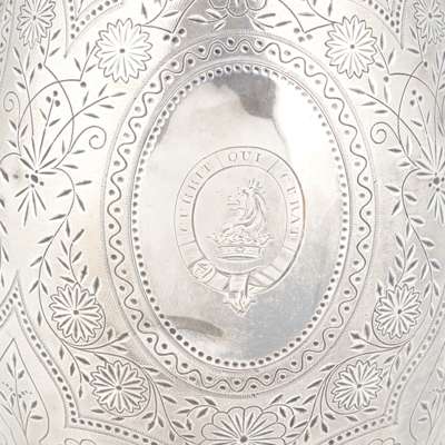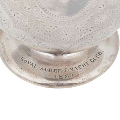 EJ, London 1866, of slender baluster form, all over engraved floral design in a textured background, four oval cartouches with floral design, one with crest and motto, the circular foot engraved 'Royal Albert Yacht Club 1867'