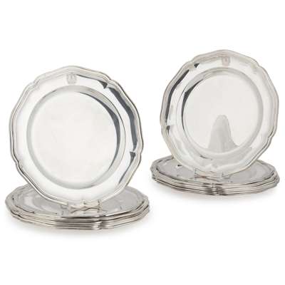 Farone, Milan, stamped 925, each of moulded circular outline, threaded border, armorial engraved to the lip (12)